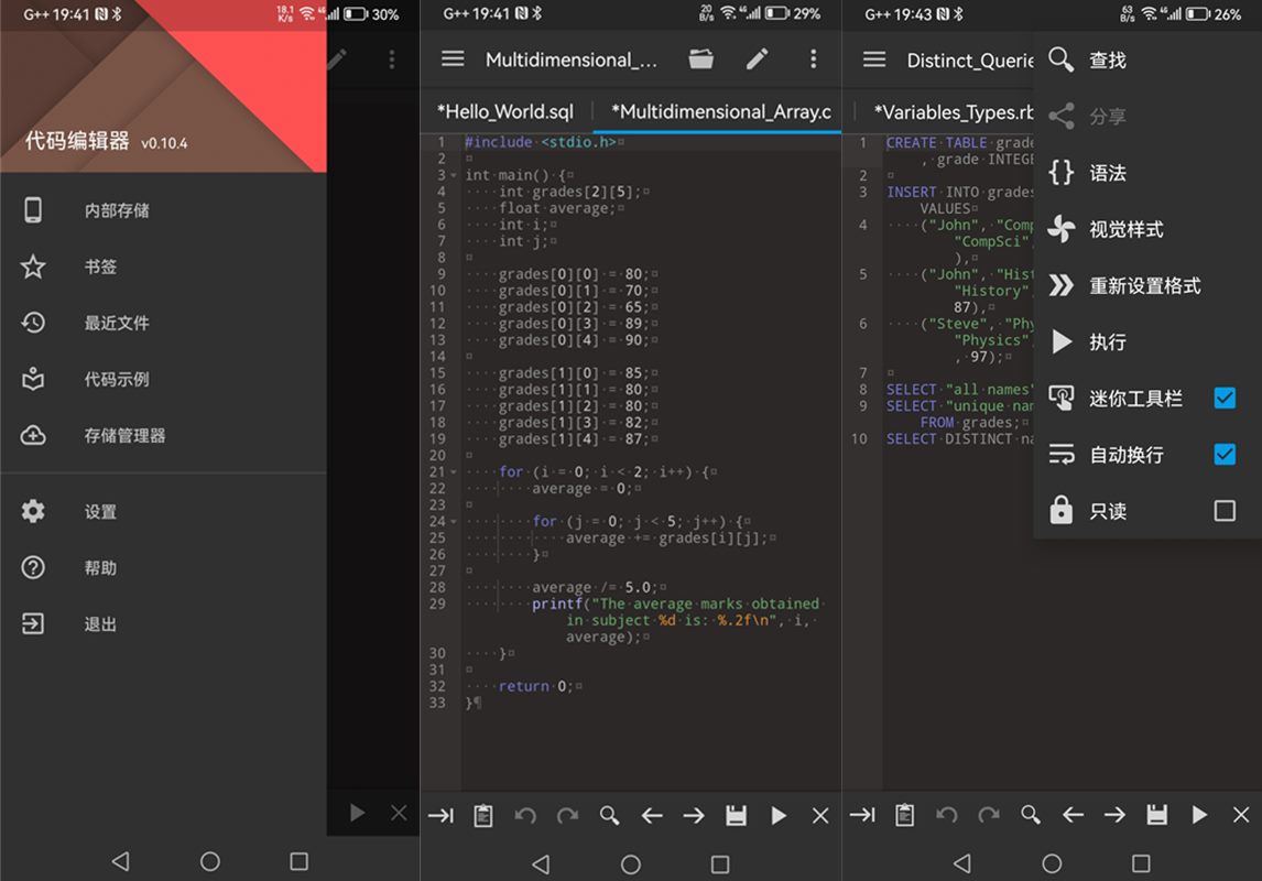 代码编辑器手机版是一款界面简洁,所有功能一目了然的软件,用户可根据自身需求轻松处理编程的一切问题。并且code editor高级版内操作十分简单易上手,不论是对于刚入手的编程学员还是老师傅的编程技术而言,这款体积小巧,操作简易的代码编辑器都值得你的体验。除此之外,通过它能帮助用户解决超过100多种语言的代码编辑,如最常见的c++、java、javascript、html、markdown、python等等,甚至还具有代码辅助、折叠和自动完成等功能,支持用户在代码编写错误时撤销和修改等操作,并且无任何限制,称常见的编码编程都可在这轻松满足。另外,类别于电脑的编程软件而言,这款代码编辑器去广告版有着得天独厚的优势所在,首先电脑版的编程软件十分笨重,电脑的不方便携带众所周知,而在手机版的代码编辑器当中完美能为用户解决这一问题,用户可以在急需代码时通过code editor去广告版轻松制作,从而更好地分享给好友或应有于工作之上,以此来大大的提高工作效率。简而言之,这款软件不论是从简单易上手的操作,还是强大的实用功能,可谓是编程人员人手必备的福音软件,但因软件内界面属于英文,为此本站所提供的代码编辑器中文版可完美的帮助用户解决这一问题,对此欢迎感兴趣的小伙伴免费下载体验。