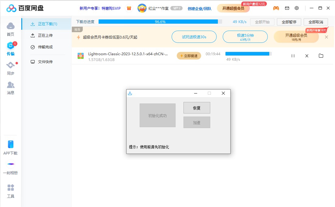 必须使用文件夹里的百度云程序,双击打开会报错误弹窗,没有任何影响,点击确定就正常 先开百度云再开补丁,补丁使用前先初始化,必须使用管理员运行,因为要释放dll文件调用变速。下载速度显示不会改变,但是下载进度是拉满带宽的!安全无毒!建议关掉系统自带傻逼防病毒,易语言写的会误报。