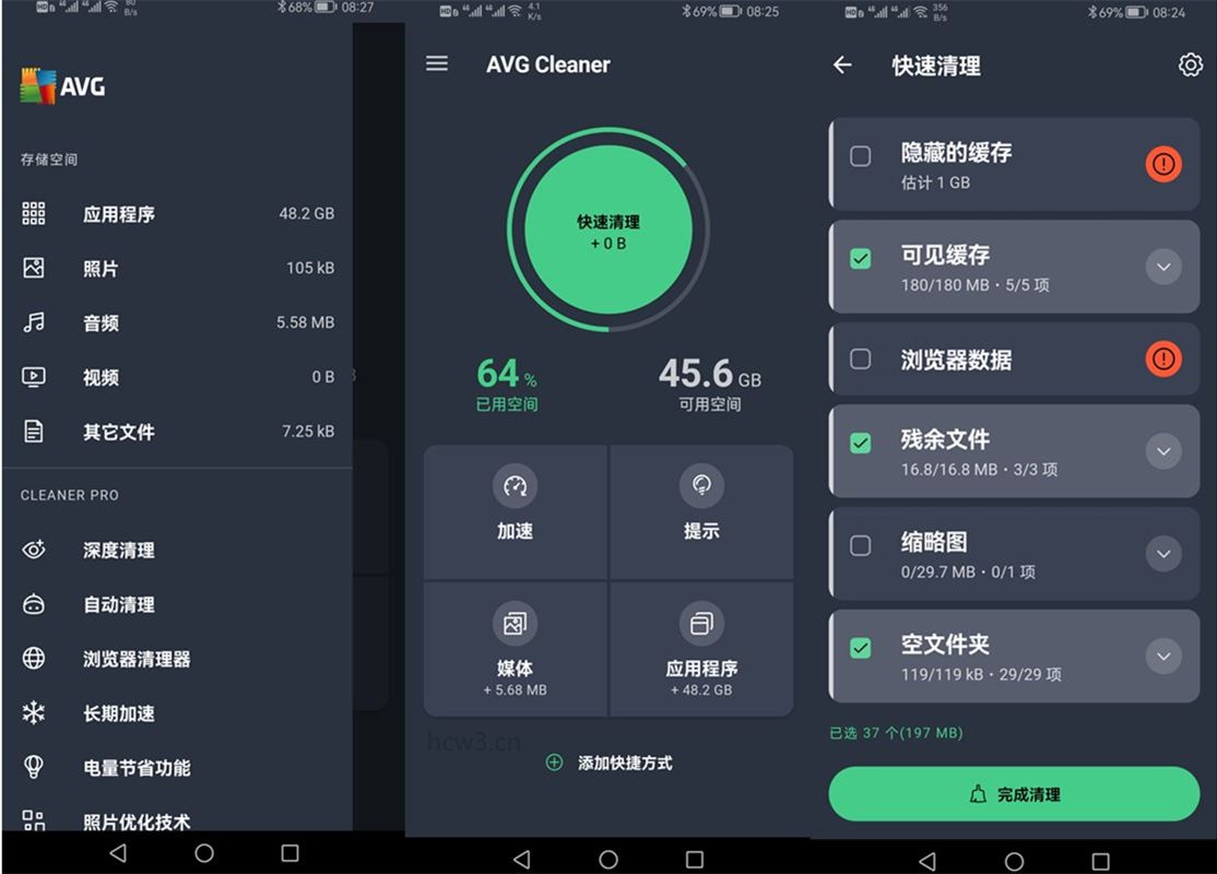 avg cleaner pro高级版是一款功能超级强大的手机深度清理工具,avg cleaner高级版有着强大的清洁功能,可以删除隐藏的垃圾,自动清理,长期加速功能,设置自动电池配置等等操作。avg cleaner pro破解版直接安装就是VIP会员版,软件功能/非常强大。avg cleaner pro会员版会自动帮助手机系统清理软件清算手机以释放存储空间,使其运转更顺畅,并进步其速度和性能。肃清渣滓文件,删除质量较差、相似或反复的照片,avg清理大师破解版会为应用程序、照片和所需的其他内容腾出更多可用的存储空间!同时它拥有着智能设备管理器和优化工具,avg清理大师会员版可使您的android设备可以更快、更顺畅地运行,存储更多数据,通过清理垃圾释放内存,并且电池更耐用。此外,该安卓手机优化清理工具的UI界面非常简约,内置多种可选的主题,支持定期杀毒、内存加速、媒体文件概览、应用程序卸载等功能,可以满足用户管理和清理方面的需求。还在等待什么?还不赶紧下载起来为你的手机瘦个身吧。